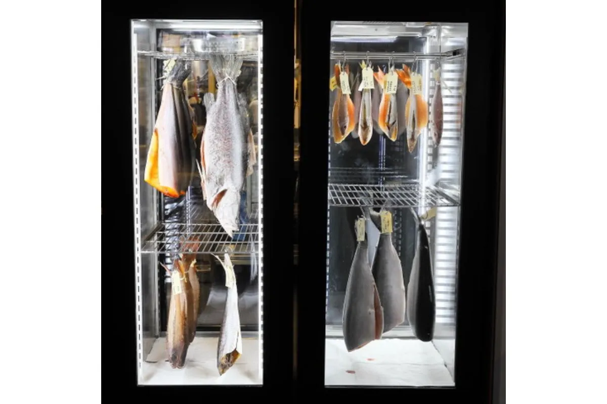 shop front of a seafood market stall with fish hanging in fridge